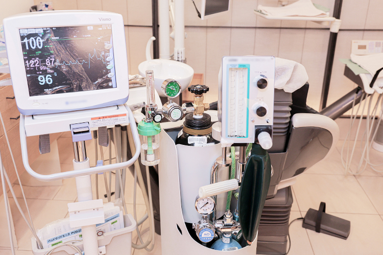 長時間お口を開ける状態がつらい方、痛みが不安な方でも快適に治療を受けていただけるよう、日本歯科麻酔学会歯科麻酔専門医による静脈内鎮静法を用いた歯科治療を行っています。完全に意識がなくなる全身麻酔とは異なり、呼びかけに反応できるかできないか程度の状態で処置を進めます。血圧や心電図、循環器、呼吸など全身の状態を常にチェックし、安心安全な治療が行えるよう努めています。